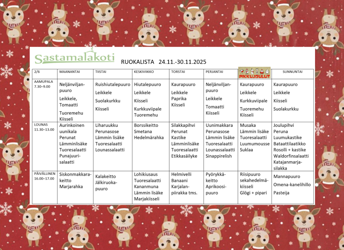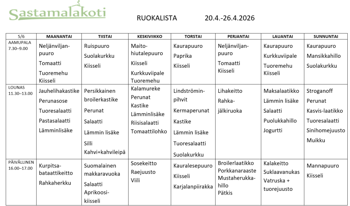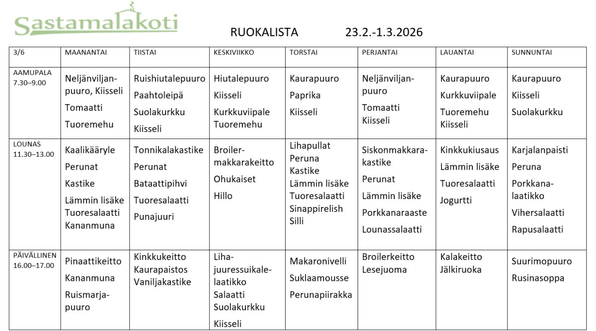 Joka aterialla: ruokajuomat, leipäkori sekä levite. Lisäksi ympärivuorokautisen hoivan asukkaille tarjotaan päiväkahvi ja iltapala.