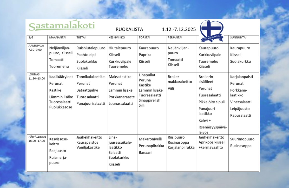 Ruokalista laaditaan ravitsemussuositusten mukaisesti ja turvataan riittävä energian, proteiinien, muiden ravintoaineiden ja nesteiden saanti. Keittiöhenkilökunnalla on apuna Jamix-ruokatuotanto-ohjelma energian ja ravintoaineiden laskussa, ruokalistasuunnittelussa, reseptiikassa ja annoskokojen laskemisessa. Erityisruokavaliot huomioidaan. Ruokalista on kiertävä kuuden viikon lista, joka tarkistetaan viikoittain mahdollisten muutosten vuoksi. Listassa huomioidaan mieliruuat, juhlapyhät ja sunnuntait.