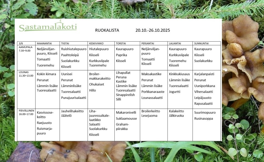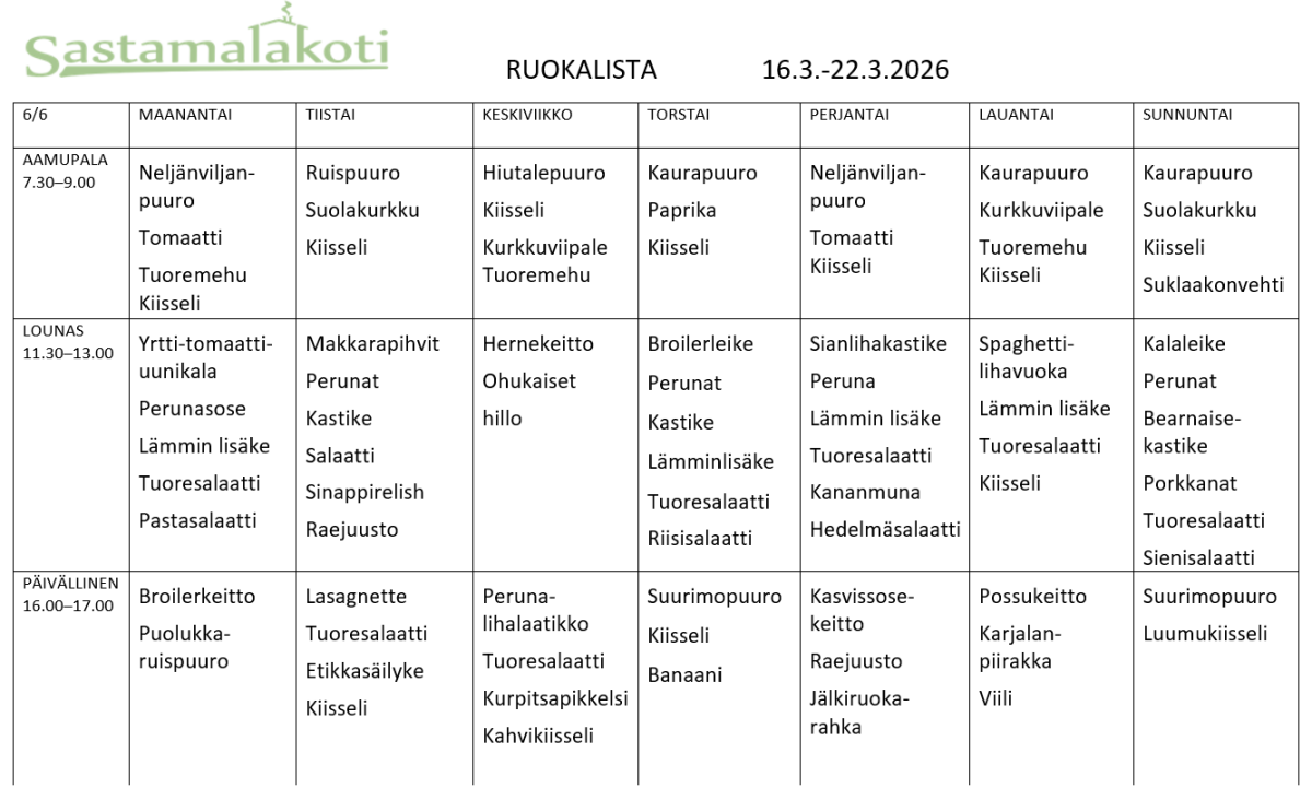Joka aterialla: ruokajuomat, leipäkori sekä levite. Lisäksi ympärivuorokautisen hoivan asukkaille tarjotaan päiväkahvi ja iltapala.