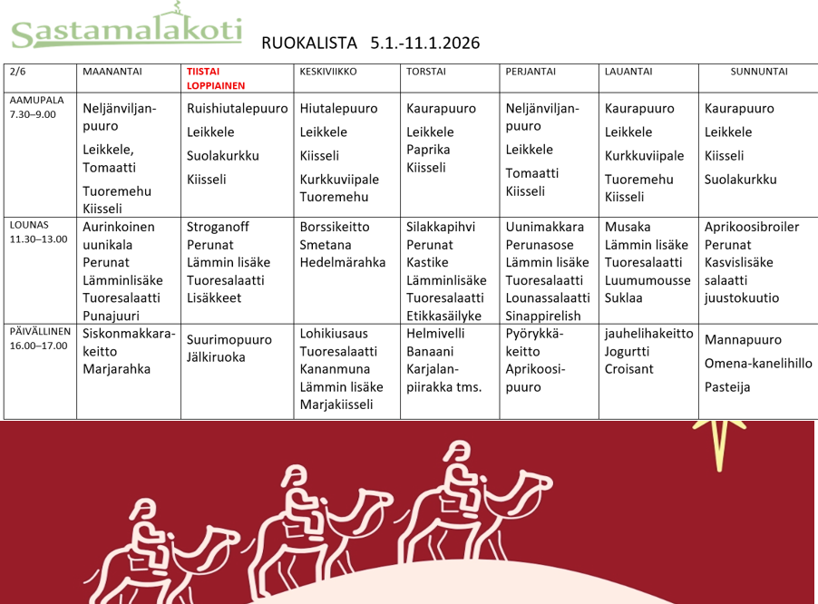 Ruokalista laaditaan ravitsemussuositusten mukaisesti ja turvataan riittävä energian, proteiinien, muiden ravintoaineiden ja nesteiden saanti. Keittiöhenkilökunnalla on apuna Jamix-ruokatuotanto-ohjelma energian ja ravintoaineiden laskussa, ruokalistasuunnittelussa, reseptiikassa ja annoskokojen laskemisessa. Erityisruokavaliot huomioidaan. Ruokalista on kiertävä kuuden viikon lista, joka tarkistetaan viikoittain mahdollisten muutosten vuoksi. Listassa huomioidaan mieliruuat, juhlapyhät ja sunnuntait.