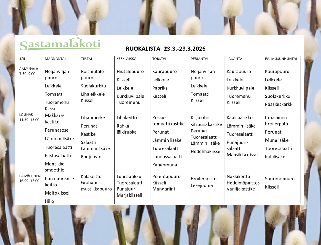 Sastamalakodilla tarjoillaan valtion ravitsemussuositusten mukaisia, monipuolisia ja maukkaita aterioita. Ruoan valmistuksesta vastaa Sastamalakodin oma keittiöhenkilökunta ravitsemusesimiehen johdolla. Raaka-aineet hankitaan eri tavarantoimittajilta suosien kotimaisia tuotteita.