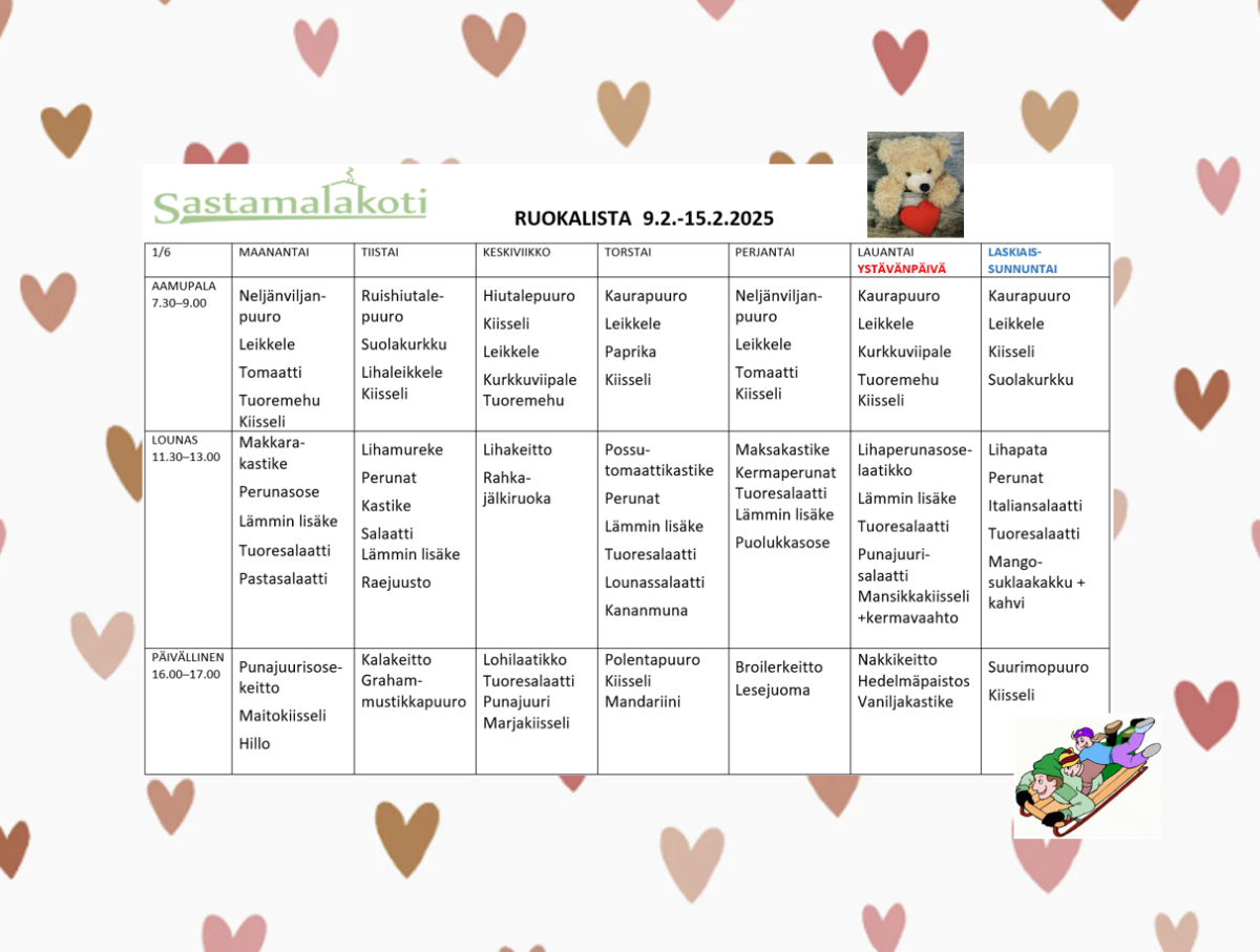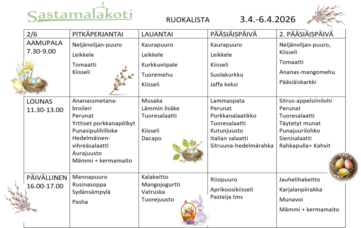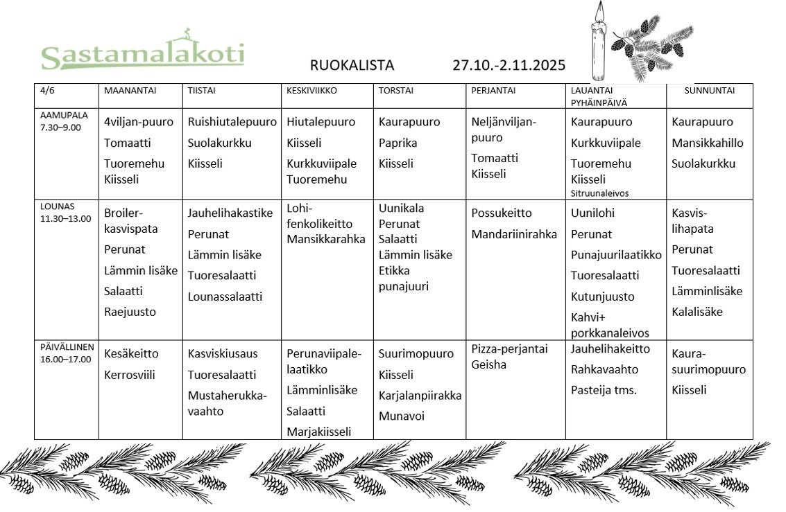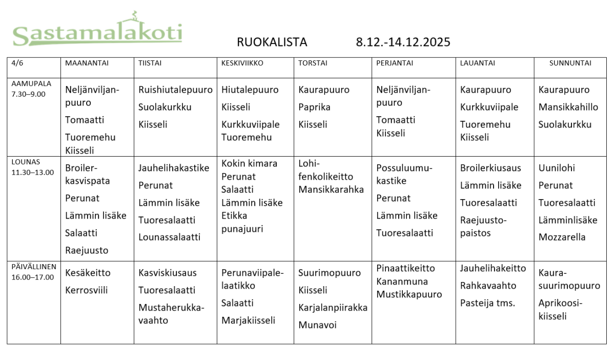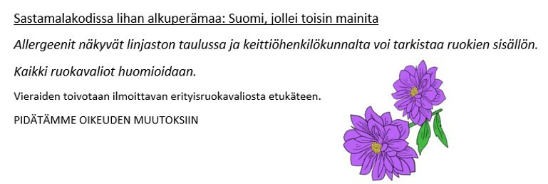 Joka aterialla: ruokajuomat, leipäkori sekä levite. Lisäksi ympärivuorokautisen hoivan asukkaille tarjotaan päiväkahvi ja iltapala.