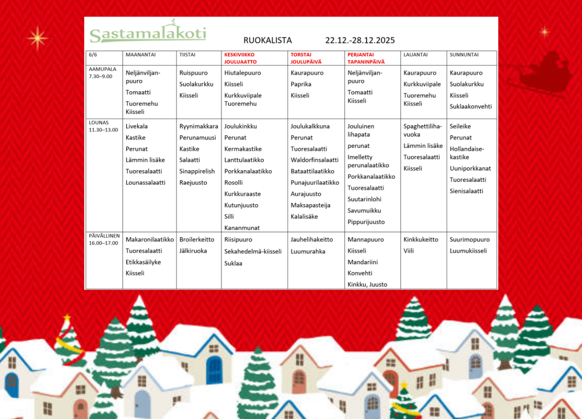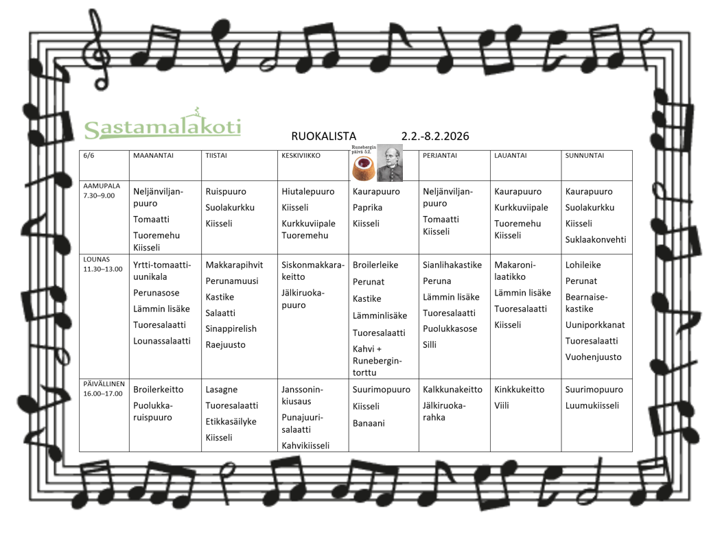 Ruokalista laaditaan ravitsemussuositusten mukaisesti ja turvataan riittävä energian, proteiinien, muiden ravintoaineiden ja nesteiden saanti. Keittiöhenkilökunnalla on apuna Jamix-ruokatuotanto-ohjelma energian ja ravintoaineiden laskussa, ruokalistasuunnittelussa, reseptiikassa ja annoskokojen laskemisessa. Erityisruokavaliot huomioidaan. Ruokalista on kiertävä kuuden viikon lista, joka tarkistetaan viikoittain mahdollisten muutosten vuoksi. Listassa huomioidaan mieliruuat, juhlapyhät ja sunnuntait.